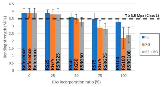 The bending strength of concrete kerb units manufactured from recycled aggregates having different particle size is presented in Figure 7. As observed with the compressive strength, the bending strength decreases as the percentage of natural aggregate replacement increases, with the precast concrete products prepared with RS showing better performance. Similar results were observed in previous studies [,,,]. The materials manufactured with 100 wt.% of RS (RS100) or 75 wt.% of RG (RG75) or 50 wt.% of RS + RG (RSRG50) presented values of resistance to flexion below 3.5 MPa. Prefabs containing up to 75 wt.% RS (RS75) and samples with 50 wt.% RG (RG50) of replacement are located on the threshold class 1 and S mark, while materials prepared with less than 50 wt.% replacement show bending strength values greater than 3.5 MPa. According to the EN 1340 [], these are classified as class 1 and S mark (characteristic bending strength ≥3.5 MPa; minimum bending strength ≥2.8 MPa), which means that they can be used in pedestrian areas or areas with little traffic.