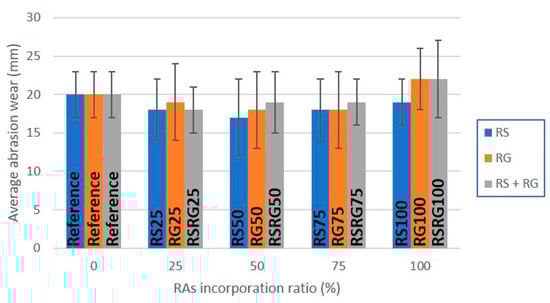 Graphical representation of the average abrasion wear vs. RAs’ incorporation ratio in pavers.