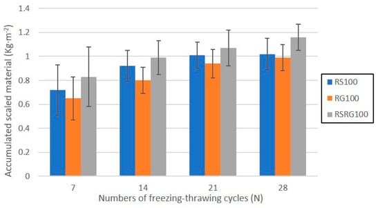 The progression of the accumulated scaled material of precast concrete samples prepared with 100 wt.% of RAs over 28 freeze–thaw cycles is illustrated in Figure 9. The overall loss of mass of the concrete elements after 28 freeze–thaw cycles was approx. 1.15 kg m−2. Accordingly, precast concrete produced from recycled aggregates satisfies the tolerance requirements for classification as class 3 in accordance with Annexes E [,]. Furthermore, the standard establishes that the loss of individual mass must be lower than 1.5 kg m−2. This requirement is satisfied by all concrete elements manufactured with the substitution of NAs by RAs, as in the most unfavourable situation (complete replacement of RS and RG and 28 freeze–thaw cycles) the loss of mass achieved the maximum value of 1.3 kg m−2. The control prefabricated units were also tested, exhibiting similar values to the precast elements with recycled aggregates. Unlike the previous properties, the repeatability of the freeze–thaw resistance values increases considerably in the concrete elements with substitution of NAs for RAs, with the increase being greater as the percentage of replacement increases.