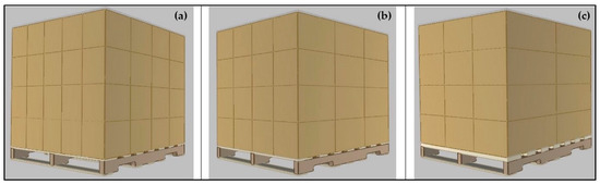 Image of investigated unit load configurations (image generated using PDS™). (a) Unit load with small boxes, (b) unit load with medium boxes, and (c) unit load with large boxes.