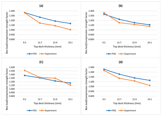 Comparison of box load factors and box compression strength factors of each type of boxes in response to pallet top-deck thickness. (a) Small C-flute box scenarios, (b) shows large C-flute box scenarios, (c) shows small B-flute box scenarios, and (d) shows large B-flute box scenarios.