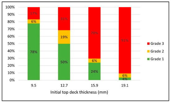 Changes in the proportions of the different grade scenarios in response to the initial top deck thickness for green wood scenarios.