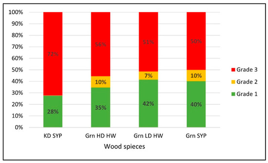 Changes in the proportions of the different grade scenarios in response to the pallet wood species. Note: KD SYP: kiln-dried southern yellow pine, Grn HD HW: green high-density hardwood, Grn LD HW: green low-density hardwood, Grn SYP: green southern yellow pine.