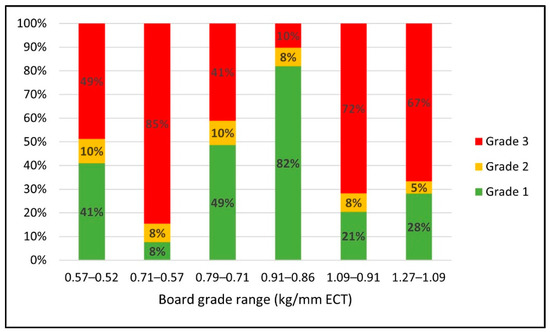 Figure 7 displays changes in the proportions of different grade scenarios as a function of the range of board grade reduction. It was discovered that for the scenarios where the ECT change is greater between the consecutive board grade levels, the proportion of grade 1 scenarios decreases, and the ratio of grade 3 considerably increases. The ratio of grade 1 scenarios ranged between 41% and 82% for the cases with 0.05 kg/mm to 0.08 kg/mm ECT reduction. On the other hand, the proportion of grade 1 scenarios ranged only between 8% and 28% when it required 0.14 kg/mm to 0.18 kg/mm ECT value reduction. These results also show that the higher the initial board grade is, the more opportunities there are to reduce the board material with minor changes to top deck thickness. For instance, the proportion of grade 1 scenarios significantly increased from 41% to 49% and 82% when the board grade reduction range was 0.57–0.52 kg/mm, 0.79–0.71 kg/mm, and 0.91–0.86 kg/mm ECT, respectively. In this analysis, higher board grade also meant that the boxes supported more weight than lower board grade boxes. It indicates that the effect was more prominent for scenarios that had greater unit load weight because having more weight in the boxes causes more bending to the deck boards, which increases stress concentrations on the boxes.