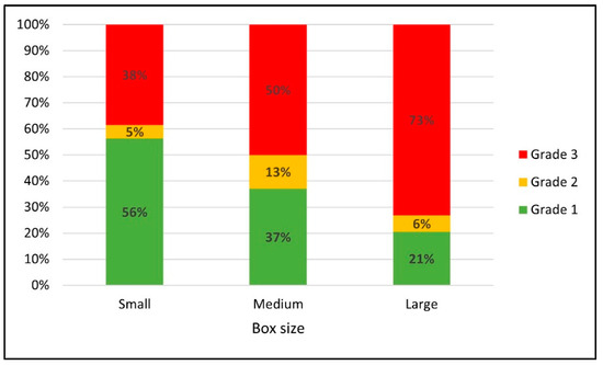 Figure 8 shows changes in the proportions of various unit load scenario grades for the three different box sizes. The proportion of the grade 1 scenarios decreased from 57% to 39% and 21% and the proportion of the grade 3 scenario increased from 38% to 47% and 72% as package size increased from small to medium to large boxes. There was no consistent trend with the proportion of grade 2 scenarios. The results indicated that the feasibility is greater to reduce the corrugated board grade by increasing the thickness of top deck boards for unit loads consisting of small-sized boxes rather than larger ones. Similar to the board grade effect, this trend could be explained by weight differences per unit load. Although each small box held a lighter weight than the medium and large boxes in this analysis, the small box scenarios contained much heavier weight as a whole unit load than the scenarios with larger-sized boxes because these unit loads required more of the small boxes to create the same size load.