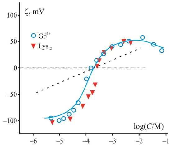 Since adsorption of large polycations and inorganic multivalent cations is largely determined by electrostatic interactions with the charged membrane surface, they demonstrate a similar shape of ζ-potential dependence on their contents measured in liposome suspension of a negatively charged lipid. The electrokinetic data in Figure 1 demonstrate this fact in the example of adsorption of trivalent cations of Gd3+ [82] and relatively short polylysine molecules (12–20 subunits) [83] on the surface of liposomes composed of phosphatidylserine (PS). In both cases, there is a sharp rise of the curve near the point of zero charge where the surface is neutral, and the electrostatic interactions are minimized. The magnitude of ζ-potential reaches its maximal value at the saturation level, which depends on the ionic strength and polymer length [84]. Note that in the case of multivalent cations, ζ-potential has a maximum and then decreases at high ion concentrations, whereas in the case of polylysines, this potential saturates. This discrepancy is caused by the fact that inorganic cations, but not polycations, participate in the screening inside the diffusion layer characterized by the Debye length. It is necessary to note here that electrokinetic measurements are related to the electric potential (ζ-potential) at the slipping plane at a certain distance from the charged surface [85]. Previously, adsorption of polylysine was measured at low ionic strength, when the ζ-potential becomes close to surface potential [84]. We accepted this condition to simplify the analysis and to evaluate the surface charge density according to the Smoluchowski relation and equations of the Gouy–Chapman model. This charge density was found independent of the ionic strength of the solution for each type of the polymers, while the surface potential was altered in full accordance with the prediction of the Gouy–Chapman model. A similar conclusion was drawn in a series of works by Duan et al. [86,87]. The authors applied the Monte Carlo method for the analysis of the efficiency of linear model polycation adsorption on the surface of membranes with different content of anionic lipids. They convincingly showed that increased ionic strength enhances the screening of the polymer charge and suppresses their adsorption, regardless of the degree of polymerization.