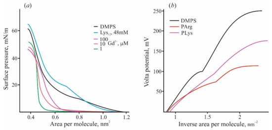 There are some other phenomena qualitatively distinguishing adsorption of polypeptides from the case of inorganic ions. Isothermal titration calorimetry (ITC) with DMPS liposomes titrated by high-affinity cations of Gd3+ reveals their participation in the lipid liquid–gel phase transition due to their ability to compact several neighboring lipid molecules into microclusters [90,92]. This fact is reflected in the compression diagrams of lipid monolayers (Figure 2a). In the presence of Gd3+ in water solution, the shape of these diagrams changes significantly, and the region with a liquid expanded state of lipid disappears [92]. On the contrary, the same diagram in the presence of polylysine preserves this region and shows the phase transition of the lipid to the condensed state. Adsorbed polymer only slightly raises the rigidity of the monolayer towards the compression and increases the pressure of passing into the condensed state. According to the data of the work [93], pentalysine lowers the pressure in the liquid phase and increases it in the gel phase, while the other peptides only decrease it with a decrease in the effect as the monolayer “solidifies”. Calorimetric measurements also show qualitative and quantitative differences in the heat effects induced by polycation and Gd3+ ions [92]. In both cases, the condensed gel phase appeared approximately at the point of zero charge. Polylysine adsorption on the DMPS liposomes in the liquid state demonstrated heat consumption significantly (about 40 times) lower compared with Gd3+ ions. When the measurements are carried out with lipids in the gel state, the heat release (exothermic effect) is 10 times weaker for monolayers with adsorbed polycations.