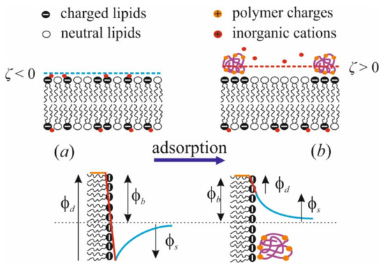 We mentioned numerous experimental and theoretical works that convincingly demonstrate that electrostatic phenomena play the leading role in the interaction of polycations with a charged surface. This fact is considered by almost all theoretical works that describe the structure of the polymer layer and its relationship with the characteristics of charged macromolecules—their primary structure, chain length, presence of side groups, etc. As a rule, the theoretical approach to such systems implies the presence of negative charges fixed on the surface and the existence of a bulk positive charge in the adsorption layer. According to experimental data, the adsorption of polycation and multivalent ions fundamentally differ from each other. Under certain conditions, the adsorbed macromolecules do not occupy the entire available surface and can form polymer–lipid clusters, with each negative charge of the surface associated with several charges introduced by the polycation. An adequate description of this fact was quantitatively described by several theoretical approaches, including scaling theory, RSA, adsorption isotherms, and by direct solution of Poisson–Boltzmann equations. Theoretical models allow us to obtain the distribution of adsorbed substance over the surface in the lateral and normal directions, to predict the conformation of adsorbed macromolecules, and to perform a quantitative data analysis of electrokinetic measurements.