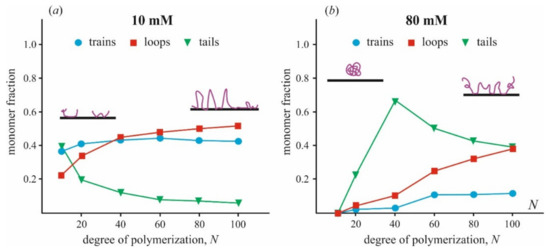 The relative fraction of polymer chain presented in train, loop, and tail conformations varied with a total number of monomer subunits N was calculated from data of [87] for two values of ionic strength (a) 10 mM, (b) 80 mM. Different states of polymer conformation are shown schematically. The fraction of unbound monomers is not presented in the plots.