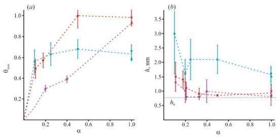 In Figure 5, we combine the literature data with those obtained by our group. In addition to our recent data of [98], we used results for small (Lys5) and large (Lys130) polymers at α = 1 and α = 0.2, and small (Lys5) polymers at α = 0.4 from [84,97], and for small (Lys8) polymers at α = 0.1 from [64]. The adsorption becomes more nonuniform for long-polymer molecules and at a small value of α. At any α, these molecules are unable to occupy the entire membrane surface (θmax < 1) and cannot form a uniform layer without loops and tails (h > h0). At the same time, small molecules of Lys5 and Lys8 (magenta curves) occupy the area corresponding to the fraction of charged lipids in the mixture, spreading uniformly on the membrane surface as a thin layer. Polymers of medium length (red curves) behave intermediately: at small values of α, they form laterally inhomogeneous structures, since θmax < 1, while at large α, they occupy almost the entire membrane. Parameters of our model allow to calculate the ratio of the total charge of the polymer layer to the total membrane charge at the saturation when the new portion of polymer molecules added to the water solution cannot bind to the surface. For simplicity, we will refer to this parameter as a capacity of the membrane to specific polymer, Cp. This parameter is expressed as Cp = θmax·h/h0 [98]. It reflects the adsorption efficiency of each type of polymer, and its ability to overcharge the surface. The values of Cp at different α, presented in Figure 6, were calculated for polymers of different sizes.