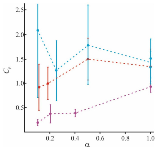 Calculated values of the membrane capacity Cp to long (blue), medium (red), and short (magenta) polymers at a different fraction of charged lipids in the membrane α.
