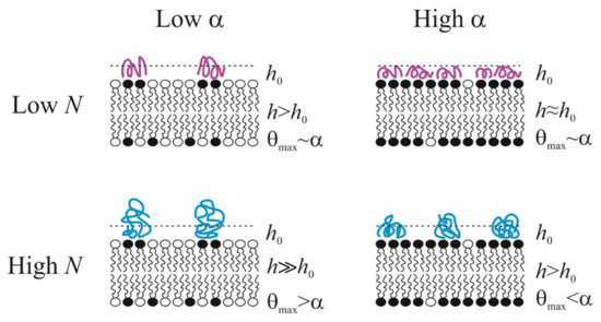 Schematic representation of the conformations of polycations with different degrees of polymerization N in an adsorption layer of thickness h on the surface of membranes with mixed composition α. h0 reflects the minimum polymer thickness in the train conformation.