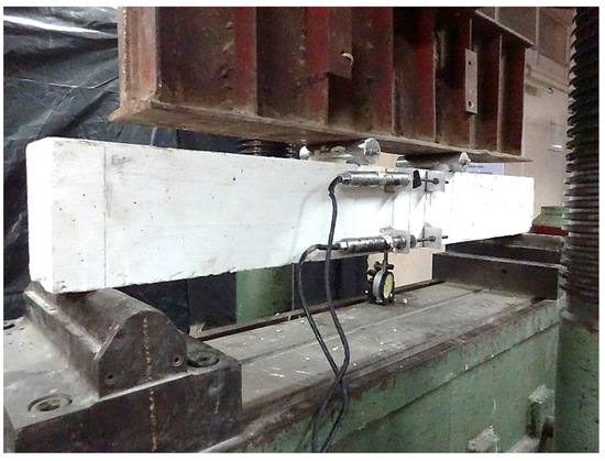 The beams were whitewashed and then tested after 28 days under a four-point loading method to observe the crack patterns. The beams were tested in a compression and bending testing machine (GDR, Blue Star Engg. Co. Pvt. Ltd., Madras, India) of 3000 kN capacity at a constant loading rate of 4 kN/min until failure. The test was conducted in a load-controlled test setup and necessary precautions were taken to keep a constant loading rate. The deformations were observed by using electrical gadgets such as LVDTs, so that at every stage of application of loading the time taken for the observation was minimal. Two LVDTs with a least count of 1 micron were fixed at the top and bottom of the mid-span. The deformation at the mid-span was noted using a dial gauge having the least count of 0.01 mm and 25 mm travel. A crack width microscope with the least count of 0.02 mm was used to observe the cracks developed in the specimens. The readings were taken at each load increment of 2 kN during the test. The actual test setup is shown in Figure 3.