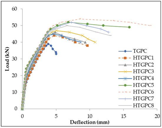 The load–deflection curves for TGPC and HTGPC beams are shown in Figure 4. It can be noted that the linearity of the curves for all the specimens deviates after the first crack load. After the first crack load, multiple cracks were formed and the slope of the curve reduced and became nonlinear [44]. The HTGPC beams show a more or less flat portion of the curve beyond the ultimate load. In contrast, a sudden fall in the load was observed after the ultimate load for the TGPC beams without hybrid fibres. From the figure, it can be observed that the first stage was linear up to the formation of the first crack. After the initial crack, the beams underwent post-cracked behaviour and the load–deformation curve behaved nonlinearly until the peak load. The initiation of inclined cracks was influenced by strain–softening of tensile concrete, but in the progressive development of diagonal cracks the dowel action of steel bars and the fibres appeared to predominate [45]. It can also be noted from the figure that the HTGPC beams with 0.5% steel fibres exhibited improved deformation with the addition of polypropylene fibres up to 0.2%. In comparison, the deformation of HTGPC beams with 1% steel fibres improved up to 0.15% polypropylene fibres. It can be observed that the further addition of polypropylene fibres resulted in reduced deformation; this is due to poor workability in the TGPC mixture with a high content of hybrid fibres [46]. In contrast, low hybrid fibre content resulted in only a marginal improvement in the behaviour of the HTGPC specimens with 0.5% steel fibres [47,48]. HTGPC beams with higher fibre proportion show less deformation for the same magnitude of the load, which shows the ductility increases due to the incorporation of hybrid fibres. HTGPC beams with a mix of 1% steel and 0.15% polypropylene fibre were found to perform better than all other specimens.