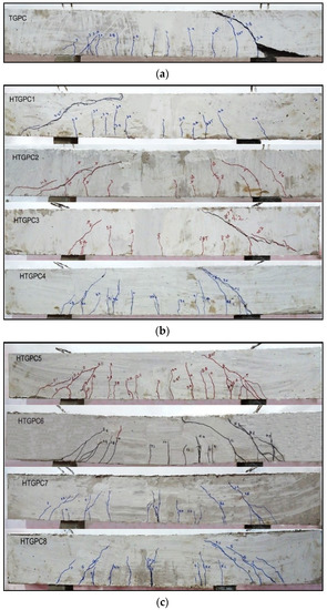 Figure 5 shows the crack patterns of the typical tested specimens after failure. Figure 5a shows that, in the plain TGPC beam, the first crack was initiated in the flexural span. When the load increased, diagonal cracks developed in the shear span and additional flexural cracks formed. As the load increased further, the existing cracks widened; at the final stage, the diagonal cracks developed faster, resulting in the beam’s failure [49]. In the TGPC specimen, the failure occurred at the shear span when one of the diagonal cracks widened and reached the specimen’s top. It can also be seen that, in a plain TGPC beam, the spalling of cover concrete occurred [50]. The addition of hybrid fibres in TGPC resulted in many finer cracks compared with specimens without fibres. In HTGPC specimens, the cracks were developed and widened at higher loads [51]. However, at corresponding loads, the crack widths of HTGPC specimens with 1% steel fibres were 60% lower than the cracks formed in TGPC specimens, whereas the average crack width was 55% lower for the specimens with 0.5% steel fibres. It may also be noted that, in HTGPC specimens, the flexural cracks are more predominant than the cracks in the shear span. In general, the incorporation of hybrid fibres delayed the first crack, increased the shear strength and changed the failure mode from shear to flexure [44].