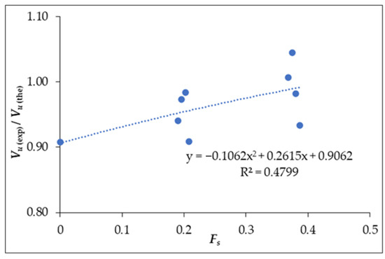 where ηbs and ηbp are the bond efficiency factor taken as 1.2 for crimped steel fibres and 1.0 for round straight fibres, respectively [54]. From the calculated shear strength values using Equation (5), the ratios of Vu(exp)/Vu(the) were obtained and related to Fs as given in Figure 6. The regression equation from the plot is,