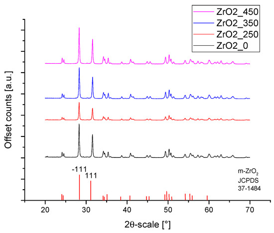Figure 1 shows the XRD patterns of APTES-coated zirconia powders calcined at different temperatures. All powders showed a typical pattern of monoclinic zirconia (P P21/c, JCPDS card no. 01-037-1484). Heat treatment has no apparent effect on the phase composition determined by XRD.
