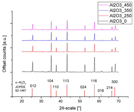 Figure 2 shows the XRD patterns of the coated alumina powders. All powders showed a typical pattern of α-alumina as the main constituent (rhombohedral, R-3c, JCPDS card 01-082-1467). There were, however, some smaller peaks between 2θ = 28–35° which indicate other components such as different types of silica: hexagonal, P3121, JCPDS card 01-080-2148 at 30.7°, cubic Fm3m (JCPDS-01-089-3609 at 33.6°), and possibly a hexagonal aluminium-silicon-oxynitride phase (JCPDS 00-48-1618 at 34.4°) (Figure 3). The accurate identification of these minor constituents remains elusive, as only the most pronounced peaks were visible and minor reflections were at the noise level.