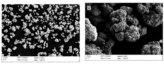 Morphology of the APTES-modified zirconia and alumina powders: (A) ZrO2_0 and (B) Al2O3_0.