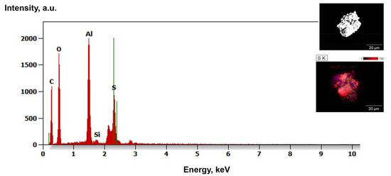 This phenomenon was more pronounced for alumina than zirconia (Figure 5A,B). Upon increasing the temperature, there was an obvious thickening of the structure and the particles were more difficult to disintegrate (Figure 6A,B). In the case of alumina, a strong tendency to bind with sulphur from the etching process was observed (Figure 7).