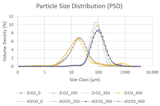 The PSD measurements of the powders after calcination at different temperatures showed that for ZrO2, the main peak did not vary in a particular direction, but between 100 and 2000 µm, the powder agglomeration became worse upon increasing the temperature. This could explain the high D90 value and standard deviation for the sample Al2O3_450. For Al2O3, calcination flattened the curve and shifted it to the right, so both the PSD and agglomeration increased with temperature. Compared with ZrO2, agglomeration did not appear to be as severe because the curves dropped very steeply.