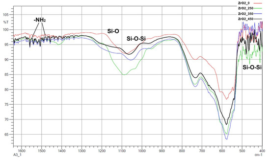 FTIR spectra are presented for zirconia (Figure 9) and alumina (Figure 10). Most importantly, -NH2 groups were present, which can improve the adhesion of the ceramic to the polymer. Two peaks responsible for -NH2 deformation modes at 1562 cm−1 and 1484 cm−1 were identified, which strongly confirm hydrogen-bonded structures with silanol groups to the zirconia and alumina [29,30,31,32]. There were also peaks at 1143–1199 cm−1, which were associated with the Si–O moieties of either polymerized or physisorbed APTES [31]. In the range of 1000–1100 cm−1, Si–O stretching/Si–O–Si stretching peaks were found [29,31]. The peak around 460 cm−1 was due to the absorption mode of Si–O–Si siloxane groups. These observations were the same for both zirconia and alumina. This seems to be in good correlation with the results obtained from EDS (Table 2) and seems to confirm that silanization has taken place.