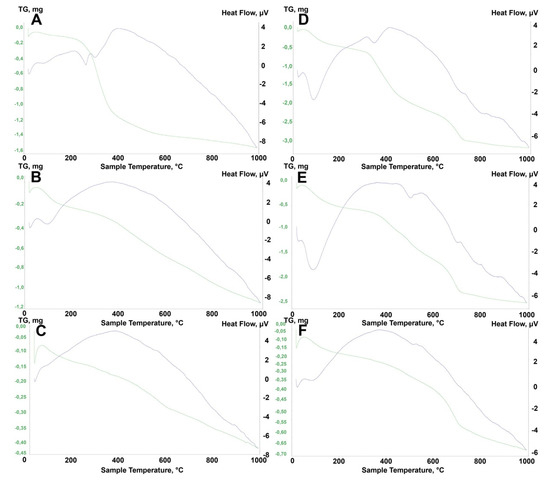 TGA curves of (A) ZrO2_250, (B) ZrO2_350, (C) ZrO2_450, (D) Al2O3_250, (E) Al2O3_350, and (F) Al2O3_450.