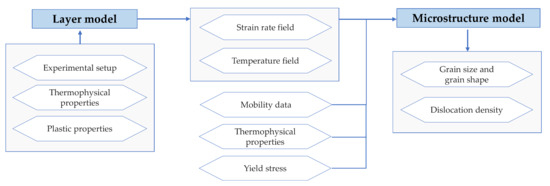 The microstructure evolution during hot rolling depends on the local stress and strain as well as the strain rate, which are determined by the material flow behavior in the roll gap and the local temperature. Therefore, the material flow is affected by the rolling geometry, tribological effects and thermo-mechanical boundary conditions. The local temperature is determined by heat transfer, thermal conductivity and the conversion of plastic work to heat in the material. The microstructure evolution during hot rolling strongly depends on the aforementioned process and material properties. To predict rolling forces, the Karman equation and slab method are applicable and already used as online roll force calculation tools [5,6,7,8,9]. Furthermore, dividing the strip thickness in different layers can give local information about strain, strain rate and temperature [10]. This local information can be used to predict the microstructure at a specific height of the hot strip and enables heterogeneous microstructure prediction.