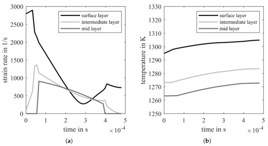 (a) equivalent strain rate and (b) temperature of surface, intermediate, and mid-layer of the hot strip in the last hot rolling pass.