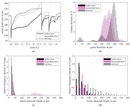 Figure 3 gives the simulated grain size as a result of the microstructure model. For the calculation the material specific data given in Table 2 were used. The evolution of the mean grain size during the last four continuous hot rolling passes is given in Figure 3a. Starting with a similar grain size across the sheet thickness, the changes in grain size across the sheet thickness become obvious. The higher strain rate at the surface leads to pronounced recrystallization effects and as a result to a smaller grain size. Besides the mean grain size, it is possible to calculate the grain size distribution, since a class-based model is used. As can be seen in Figure 3b, multimodal distributions are present after the last hot rolling pass. The different peaks are the result of the deformation steps. New grains appeared in the small grain classes because of the deformation induced nucleation and changed to higher grain classes because of grain growth at these temperatures. The grains are calculated to have a representative equivalent grain diameter and are allocated to a grain class with the respective volume fraction. To compare the simulation results to experimental data, the simulation data are converted. Based on ASTM E112-12 [34], the grain diameter is converted to a lineal intercept length and the volume fraction to a relative frequency density, see Figure 3c,d. The simulation overestimates the grains of smallest fractions. Nevertheless, the spread in grain size is represented with grain sizes of around 200 μm in the mid-layer.