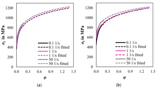 Initially, a 2D finite-element rolling model is created using ABAQUS/Standard. The simulation setup mimics an experimental cold rolling trial, i.e., rolling from an initial thickness of 1 mm to a final thickness of mm in 6 passes as presented in [38]. The necessary elastic and thermo-physical parameters are calculated using the software JMatPro version 8.0.2 based on the chemical composition given in Table 1. For the simulation the following values at room temperature were calculated: Young’s modulus 194,108 N mm, Poisson’s ration 0.29137, conductivity m W mm−2K−1, density g.cm−3, 459 J kg−1 K−1. As for the rheological parameters, the flow curves were obtained through layer compression tests [39] with various strain rates (0.1 s−1, 1 s−1, 50 s−1) on a hydraulic testing machine. To ensure that the curves are reliable, each test condition was repeated three times and only experimental data up to strains of 0.25 were used. As higher strains are required for the cold rolling simulation, all the flow curves were extrapolated to a strain of 1.4 by the method proposed in [40]. Figure 5 shows the experimental and fitted flow curves of two different hot strips. The agreement between the experimental data and the fitted data is very good.