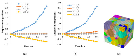 Displacement gradient in cold rolling of Fe3.2wt.%Si with a homogenous microstructure, (a) in the mid-layer and (b) near the surface. (c) Corresponding RVE with 300 grains used in both cases. 11—displacement gradient in normal direction, 22—displacement gradient in rolling direction, 12 and 21—displacement gradient indicating shear, C—mid-layer, S—near surface layer.