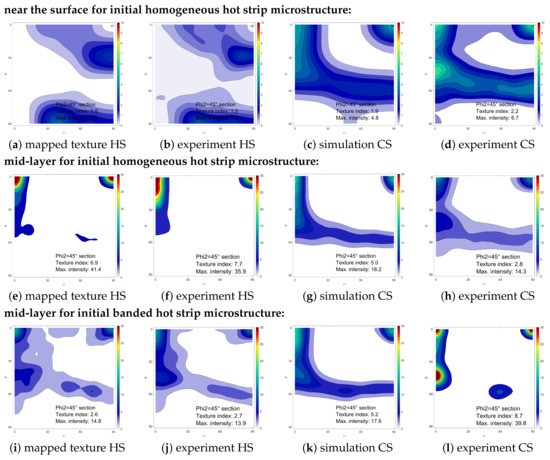 Comparison of experimental and simulation results for the texture evolution in Fe3.2wt.%Si steel. (a–d) Measured and predicted texture evolution near the surface of a homogeneous hot strip microstructure, (e–h) Measured and predicted texture evolution in the mid-layer of a homogeneous hot strip microstructure, (i–l) Measured and predicted texture evolution in the mid-layer of hot strip with a banded microstructure. HS—hot strip, CS—cold strip.