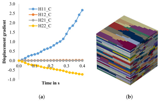 In another previous study [47], the texture development during cold rolling of hot strips with different textures were investigated. Therefore, it is important for the cold rolling model to have the ability to simulate the texture evolution based on different initial hot strip states. In the following, a Fe3.2wt.%Si hot strip with a banded structure is used as initial state. Based on the flow curves (Figure 5), the parameters for phenomenological model are fitted, see Table 3. The RVE with band structure was created in NEPER, and the displacement gradient in the mid-layer was calculated (Figure 8).