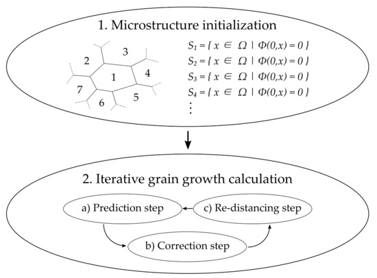 First, the microstructure needs to be initialized. In this context, every grain receives its own zero level-set signed distance function Equtaion (16) representing the entire grain and grain boundary during simulation. Next, grain growth is calculated in an iterative manner. Therefore, three steps (Figure 9a–c) are repeated until an abort criterion is fulfilled. Initially (Prediction step), the movement of each individual grain boundary is calculated based on the driving forces acting on it, before each movement is corrected based on individual anisotropy effects, in our case grain boundary energies, grain boundary mobilities and triple junction mobilities. Due to this individual consideration of grain boundary movements, there are overlaps and voids in the microstructure after this initial step that are corrected in the Correction step. In order to start with the Prediction step again, the level-set functions of each grain needs to be reinitialized (Re-distancing step) to their zero level-set signed distance functions Equtaion (16). One big advantage of this procedure is that it allows parallel computation. For a detailed description of the approach, the reader is referred to [16,48]. In the following section, the focus is on the actual use of the model as well as on a case study. The initial microstructure can either be directly taken from the cold rolling model described above Section (Section 4), an EBSD measurement where values for dislocation densities and subgrains need to be added or it can be artificially created through an optimized microstructure generator [49], where parameters like subgrain size, subgrain orientation, texture, dislocation density and grain shape can be assigned manually. In the following section, the latter is used.