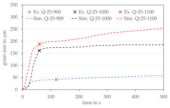 As can be seen in Figure 10, there is always a unique point at which the slopes of the grain size—time curves change. This point can be correlated with the time where the randomly distributed and fast growing nuclei touch each other. In the following, the first section will be called recrystallization (RX) section and the second one grain growth (GG) section. Within the RX section, mainly the randomly distributed nuclei grow very rapidly after a short incubation time due to the here dominating SEE driving force. As soon as the nuclei with their low SEE touch each other and all grains have more or less the same SEE this driving force vanishes. From this point, the always present driving force to minimize the grain boundary energy through minimizing the grain boundary curvature becomes the dominant driving force, which is directly correlated with grain growth. It is recognizable that the grain size results of all three annealing experiments could be reproduced perfectly. However, the nuclei density was determined empirically to match the experimental data point. In the future, it would be desirable to experimentally confirm entire curves, rather than individual points as shown in Figure 10, so that with greater confidence in the actual position of the changes in slope of the grain size-time relationship, the best annealing time can be identified with respect to the application dependent grain size. Current developments in the use of in-situ, and therefore much more continuous, characterization of grain size and texture over time [44] suggest that this should indeed be possible in the near future.