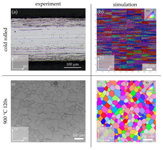 In the following section, simulation results (kinetic, microstructure and texture development) will be validated by individual experimental results (see [38]). Therefore, the experimental annealing process of a mm cold strip annealed at 900 °C to 1100 °C will be compared to simulation results in depth.