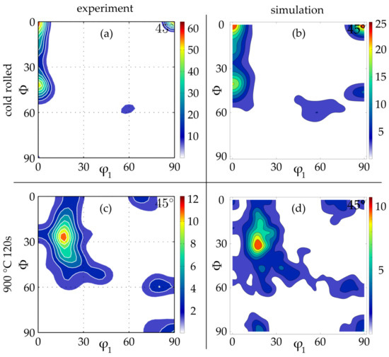 The experimental hot strip texture is mapped to an RVE with a banded grain structure with a high degree of conformity, see Figure 7i,j. In the simulated result, the cold strip texture is not as greatly intensified as in the experiment, but the tendency of -fiber and ND-Cube strengthening is captured.