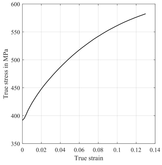 The layer model can be applied to different materials. To describe the specific material, a flow stress model depending on temperature, strain and strain rate is necessary. One applicable model is the Freiberg flow stress law as described in Equation (1) with temperature in °C, logarithmic equivalent strain , logarithmic strain rate and the material dependent parameters and . The mean flow stress of all layers combined is calculated as the weighted arithmetic mean with height h of the individual layer j and total height of the strip , Equation (2). The equivalent logarithmic strain is computed for each layer according to Equation (3) as proposed for flat deformation by Mises material law [28]; denotes the rotational frequency of the roll, the roll radius, the projected arc contact between rolls and metal, and the smallest roll gap height. For the equivalent logarithmic strain rate a mean value according to Hoff and Dahl [29] as in Equation (4) was used to simplify the iteration structure and convergence. In [8,10], the possibility of calculating local strain speed is described.