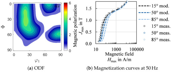 Non-oriented electrical steel (NO electrical steel) is widely used in electrical machines with rotating magnetic fields. Although the name indicates isotropic behavior, NO electrical steel has dominant texture components, resulting in magnetic anisotropy [1,2,3]. Furthermore, additional anisotropy can result from a residual stress distribution or an anisotropic grain size distribution. Therefore, it is necessary to use models that link material parameters and magnetic properties.