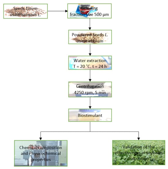In search of new species of plants with biostimulating potential, linseed was selected as a candidate due to its wide use in conventional medicine, herbal medicine, pharmacology, and cosmetology. Linum usitatissimum L. is a herbaceous plant species of the family Linaceae grown in almost all parts of the world. The health benefits and therapeutic action of the plant have been recognized since antiquity []. Linum usitatissimum L. has a rich chemical composition, which includes lignans, fiber, fatty acids, and amino acids [,,]. Linum usitatissimum L. seed extracts also have a high antioxidizing potential, owing to the presence of the anti-oxidant gamma-tocopherol [,]. Jhala and Hall [] have found that it is due to these properties that Linum usitatissimum L. is considered to be a platform or “matrix” crop for the development of novel bioproducts. Our team’s previous work showed that aqueous extracts of linseed were effective in improving germination capacity and emergence in plants and inhibited fungal and bacterial contamination of seeds of white mustard, white cabbage, yellow lupine, garden pea, fodder beet, sugar beet, beetroot, winter rape, and turnip rape, as well as spring barley grains [,,,,]. The positive response of the seeds and seedlings to allelopathic extracts have led us to undertake research on developing a novel crop biostimulant that would not have any residual or toxic effects on the environment. The use of such a product could thus also contribute to environmental protection by helping maintain biodiversity through supporting the growth of invertebrate populations, including pollinators and other beneficial arthropods that serve as natural allies in pest control, with the preparations being designed so as not to be harmful or toxic to such species. This approach to providing effective methods for sustainable development of crop production and ecological biosystems [,,,,] is consistent with the current EU biodiversity strategy for 2030. The criteria used by farmers when implementing new agronomic practices should also be considered—novel biostimulant products must be designed and developed with cost-effectiveness of their use in mind [,,]. In this sense, a proven economic benefit is a critical success factor for the actual adoption of any bioproduct [,,]. Through the lens of these factors, we conducted an investigation into the viability of using Linum usitatissimum L. as a source of ecological biostimulants. The aim of the present study was to develop a novel biostimulating product, based on plant material in the form of linseed aqueous extracts. The scope of the research included the physicochemical characterization of the new product and identification of its biostimulating potential and effectiveness in cultivation of Abelina variety soybean (Glycine max (L.) Merrill). This comprehensive approach to developing, testing, and performance profiling of the plant bioproduct will make it possible to assess its agronomic potential, and thus register and market it as a novel product.