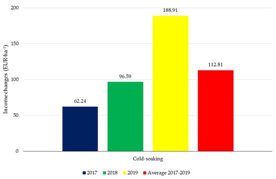 The application of the linseed extracts increased the profit from the cultivation of soybean (Figure 2). The use of the macerates brought high economic benefits with an average value of 112.81 EUR·ha−1. The results of the three-year experiment showed that the meteorological conditions in the individual growing seasons determined the soybean yield level, and thus, the recorded income. The economic benefits resulting from the use of the botanical biostimulants from flax seeds were observed in the last year of the field experiment; they amounted to 188.91 EUR·ha−1 after the foliar application of the cold-soaking product.