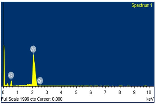 FESEM-EDX were used in the study of the morphology of ZrO2 particle (Suzhou Beike Technology Co., Suzhou, China) shape and size with the magnification of ×100,000 (Figure 1 shows the particle sizes of ZrO2, ranging from 70 to 211 nm). They deviated slightly from previous findings due to the inefficient dispersion of the powder during particle size analysis in this study. The purity of the reinforcement (Table 3) shows the EDX analysis (Figure 2) of the ZrO2 nanopowder, confirming the presence of Zr and O.