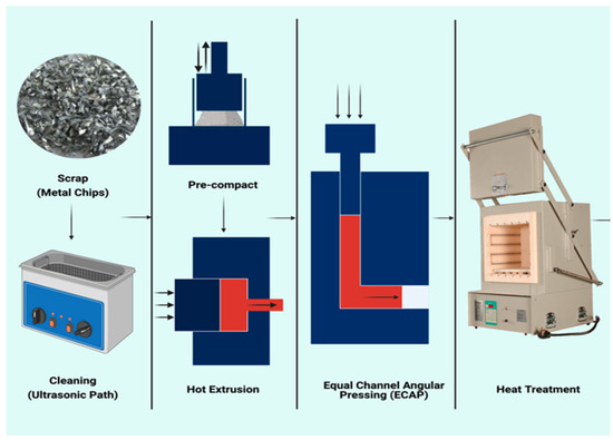 Conventionally, the recycling of aluminium scraps is carried out through re-melting at high temperatures with the recovery of most of the materials [1]. However, the loss of materials and the high-energy requirement in the conventional recycling method [2] have encouraged the development of eco-friendly and economically viable methods to address the environmental issues of air pollution. This method, broadly known as solid-state recycling, involves the direct treatment of alloy chips [3,4]. Solid-state recycling, such as hot extrusion and ECAP, optimises energy, using the plastic deformation technique to recycle metal scraps and various alloys [5,6,7]. Furthermore, heat treatment after solid-state recycling, i.e., hot extrusion, improves the mechanical properties of the alloy with the formation of secondary phases and the homogeneous distribution of fine precipitates [6]. The hot extrusion solid-state recycling process not only conserves the environment but also prevents the generation of new waste material [7].