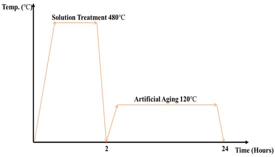 Heat treatment (HT) was performed using an electrical box furnace at a quenching temperature of 465 °C for 55 min and an artificial aging process at 120 °C for 24 h (Figure 4). Water was used as the quenching medium.