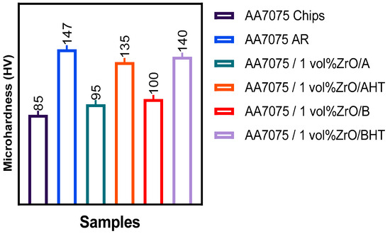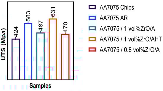 The tensile strength of the Al chips and Al-ZrO2 composites produced from hot extrusion was congruent with the original material of T6-AA7075 containing 1% ZrO2 nanoparticles and a preheating temperature of 550 °C. Figure 5 shows the ultimate tensile strength (UTS) of the extruded samples due to work hardening. The tensile strength values were 583 MPa for the sample AA7075 as received (AR), 470 MPa for the sample after hot extrusion with 0.8% ZrO2, and 631 MPa after heat treatment. The extrusion encompassed the recycled Al chips and Al-1 vol% ZrO2 composites with a tensile strength of 424 MPa and 487 MPa, respectively, showing an enhancement in the mechanical properties of MMC. The tensile strength of Al–ZrO2 was enhanced with the addition of nanoparticles until 1 vol%, after which it decreased with the increment of nanopowder and optimised processing parameters for hot extrusion. The strength of the recycled MMC-based composites increased due to work hardening. These results showed a substantial increase in properties in heat-treated samples.