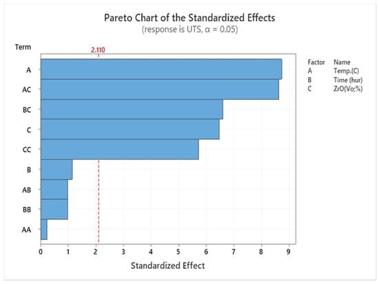 The results suggest that specimens heated to the maximum temperature may have greater tensile strength. As the temperature rises, AMC becomes stronger and exposes the enhanced microstructure. By increasing the temperature to 550 °C and reducing the volume fraction to 1%, the tensile strength is increased to its maximum value. According to RSM’s explanation, it is obvious that the key parameter list that affects the investigation factors of the UTS of the extruded sample is T and ZrO2. On the contrary, time is not significant. SEM shows the sources of variance in Table 6, showing the p-value of the linear model. Temperature and reinforcement are significant, but the lack of fit is not significant. In the factor list, these factors are represented by p < 0.05, as shown in the Pareto charts shown in Figure 6.