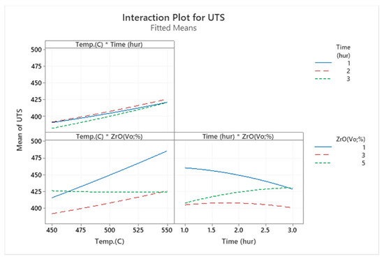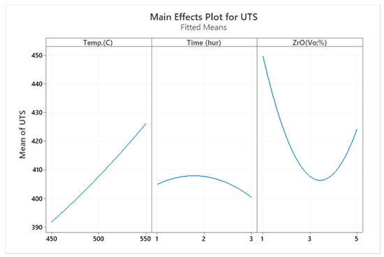 Specimens heated to the maximum temperature appeared to have greater tensile strength. As the temperature rose, aluminium matrix composite (AMC) became stronger and exposed the enhanced microstructure. Figure 5 shows that at 550 °C with the volume fraction reduced to 1%, the tensile strength attained its maximum value, i.e., 487 MPa. Additionally, the samples extruded at 450 °C with a 5% ZrO2 volume fraction showed poor strength (426 MPa). These results were consistent with that of another study [13]. Figure 7 shows the main effect plot in the full factorial analysis, indicating that all the centre points, from low to high preheating temperature settings, were extremely close to the straight line of the average tensile strength. Preheating temperature (T) as a factor had a linear relationship to the UTS response. The tensile stress tended to decrease considerably with the increase in zirconium oxide up to 3% vol, where it started rise. Thus, the maximum UTS was obtained at the peak temperature at 550 °C and volume fraction at 1%, as shown in the interaction plots in Figure 8.