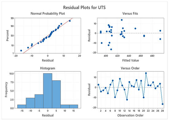Figure 9 shows the residual plot for tensile strength. It is observed that the residual for UTS almost displays curvature in the normal probability plot. The closeness of the graph indicates that errors are negligible since they are in the tolerable margin.