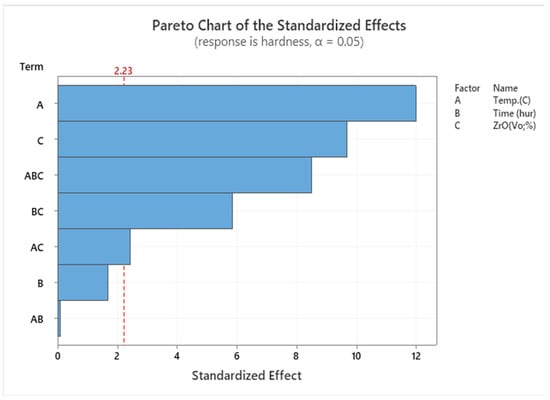 Figure 10 shows the hardness of samples and Figure 11 shows the Pareto chart of the standardised effects. Regarding the hot extruded sample, the hardness (95 HV) was attained at 550 °C, 1 h, and 1% for T, t, and VF had increased to 135 HV after the heat treatment. Subsequent ECAP reduced the microhardness to 100 HV, but it increased again to 140 HV with further heat treatment.